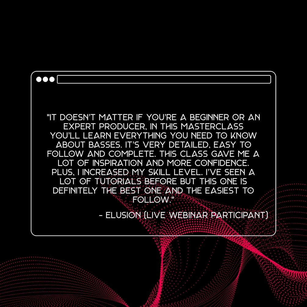 "It doesn’t matter if you’re a beginner or an expert producer, in this masterclass you’ll learn everything you need to know about basses. It’s very detailed, easy to follow and complete. This class gave me a lot of inspiration and more confidence. Plus, I increased my skill level. I’ve seen a lot of tutorials before but this one is definitely the best one and the easiest to follow.