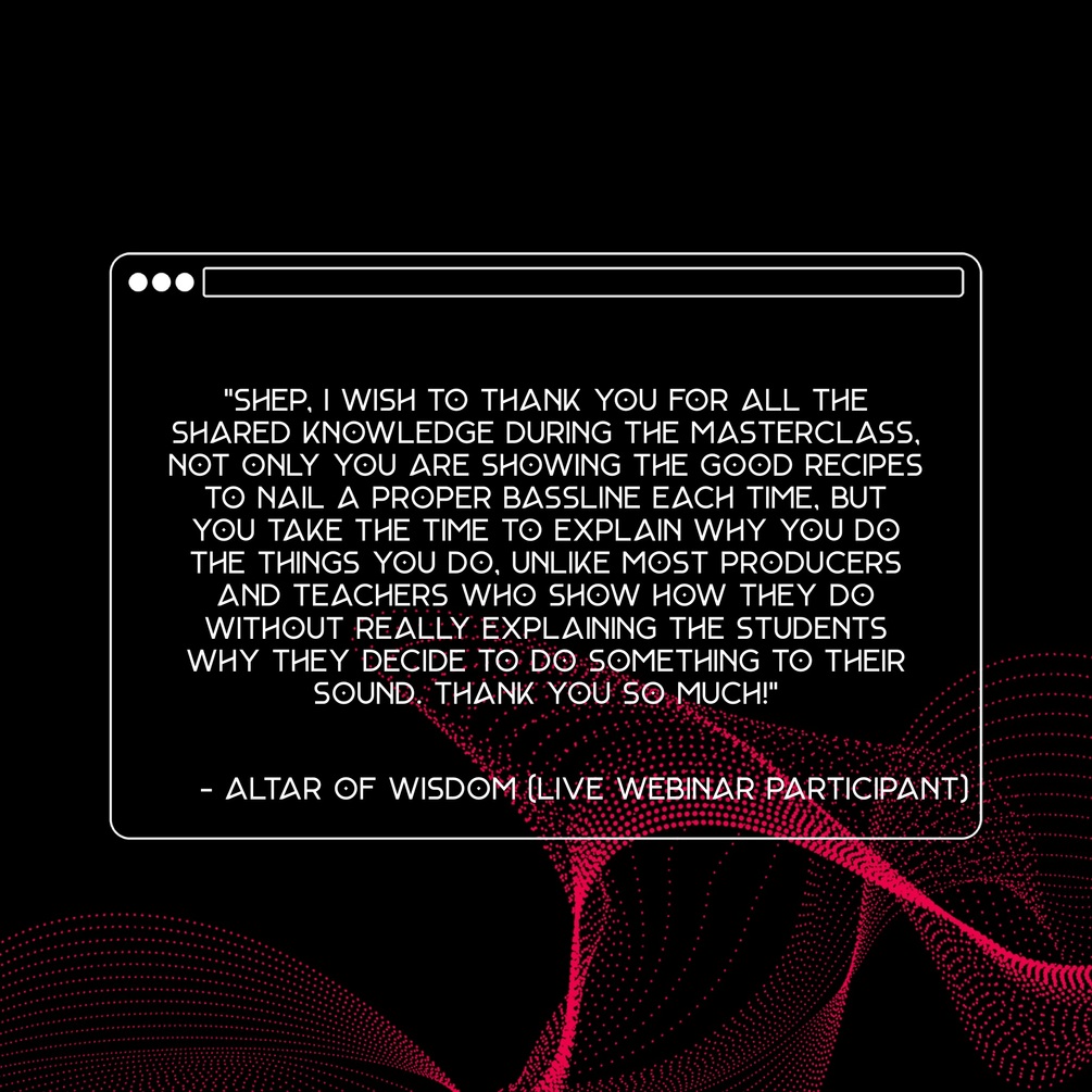 "Shep, I wish to thank you for all the shared knowledge during the masterclass, not only you are showing the good recipes to nail a proper bassline each time, but you take the time to explain why you do the things you do, unlike most producers and teachers who show how they do without really explaining the students why they decide to do something to their sound. Thank you so much!" - Altar of wisdom (Live Webinar participant)