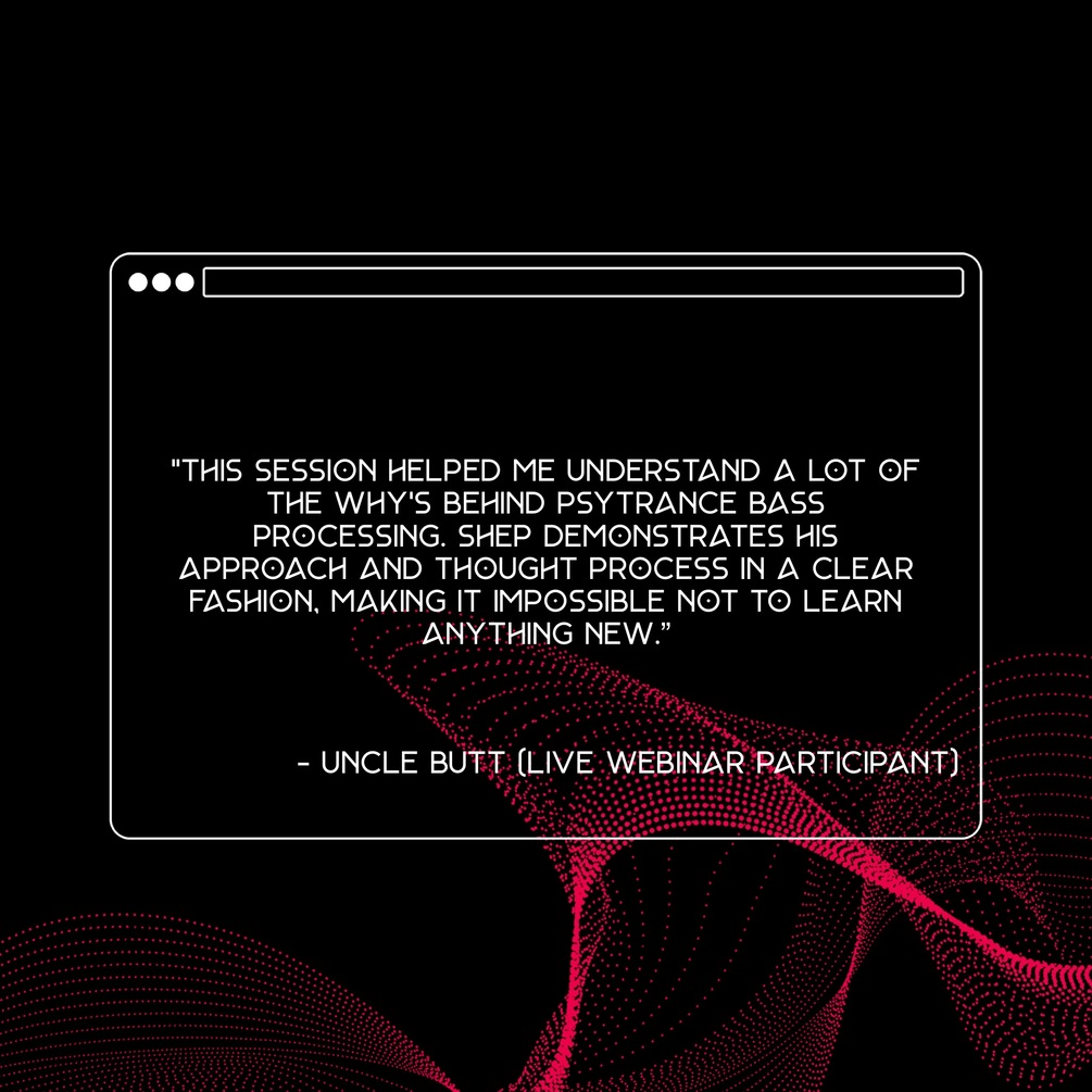 "This session helped me understand a lot of the why's behind psytrance bass processing. Shep demonstrates his approach and thought process in a clear fashion, making it impossible not to learn anything new. - Uncle Butt (Live Webinar participant)
