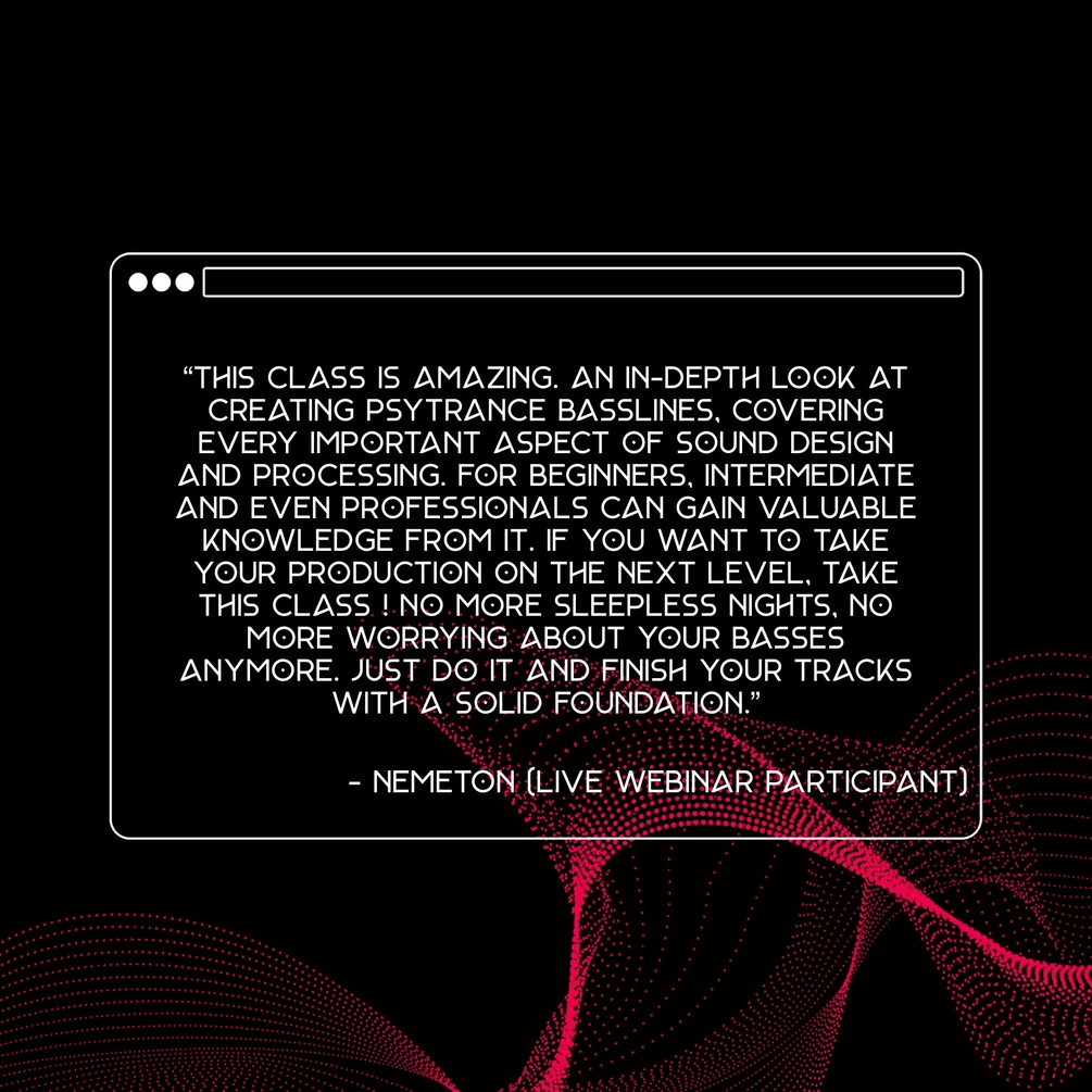 “This class is amazing. An in-depth look at creating psytrance basslines, covering every important aspect of sound design and processing. For beginners, intermediate and even professionals can gain valuable knowledge from it. If you want to take your production on the next level, take this class ! No more sleepless nights, no more worrying about your basses anymore. Just do it and finish your tracks with a solid foundation.” - Nemeton (Live Webinar participant)